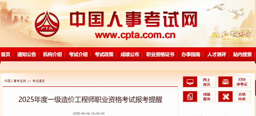 中国人事考试网发布2025年度一级造价工程师职业资格考试报考提醒,明确了考试报名时间和注意事项。
